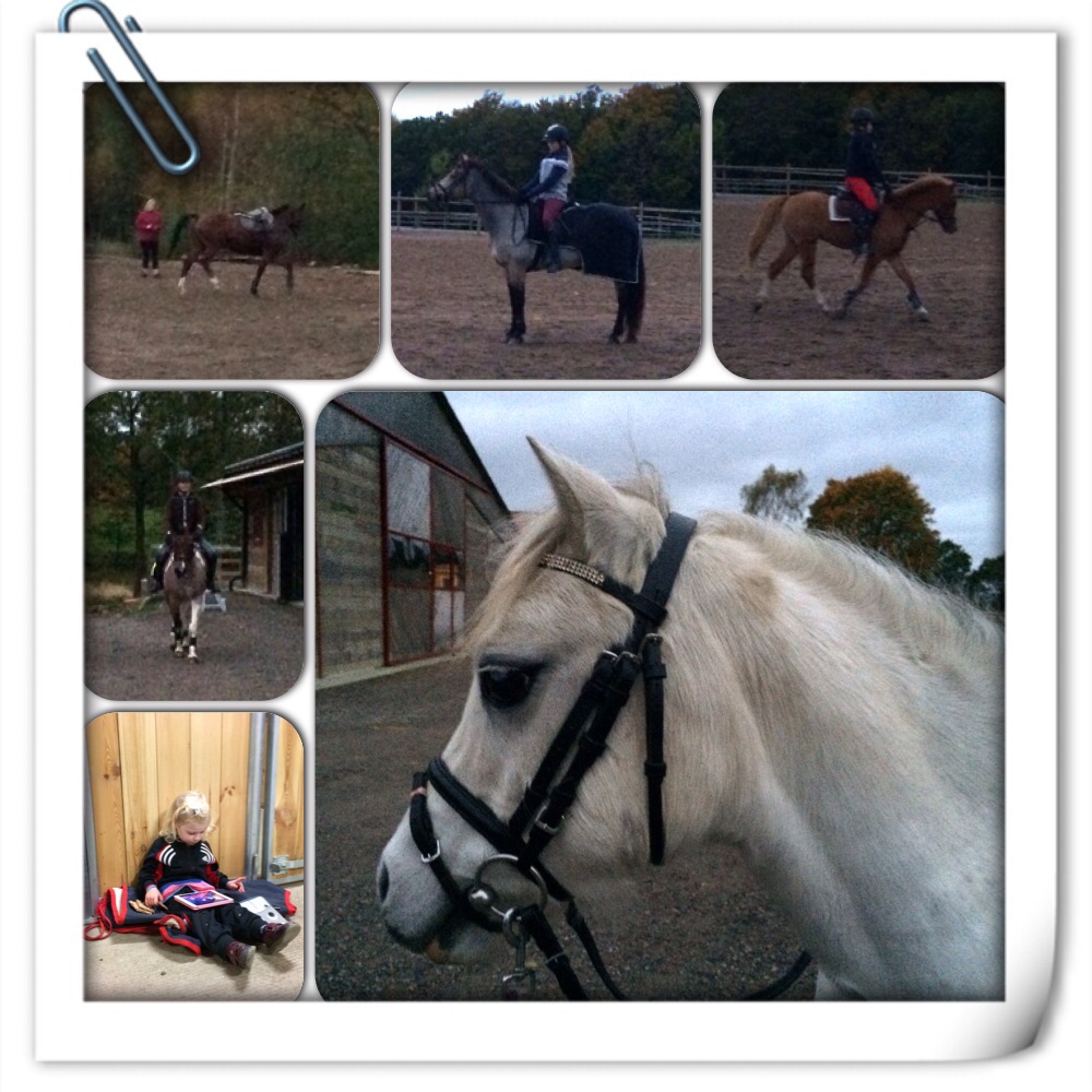 Det var full aktivitet i stallet idag. Erika hoppade vattenmatta när vi kom, de var jätteduktiga, hon och Bigge. Linn red ut, Ann logerade Sita -vilket steg hon har – Penny skrittade Isadora -söt som socker, och Thea och Elsa red på banan. Elsa red Nalle idag för Olivia kände sig inte riktigt pigg.