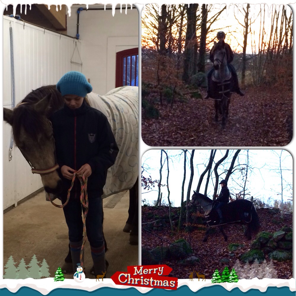 Connie fick prova sina nya julklappstäcken och grimma och sedan gav vi oss ut på en promenad i skogen, varken jag eller Thea var särskilt sugna på ett riktigt pass i ridhuset. Det närmade sig skymning innan vi hann iväg, Connie och Musse var på strålande humör och fick oss att lätta på sinnesstämningen oxå. När vi for hemåt kändes det bättre.