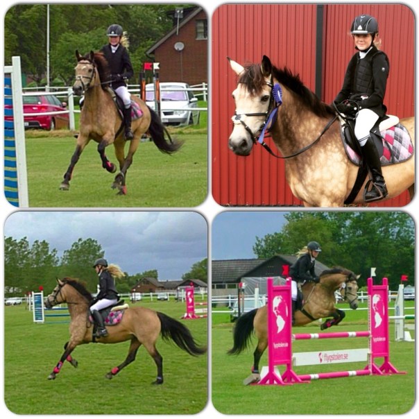 Igår klippte vi Connie. Nu är fina vädret slut och pälsen var på tok för lång. Hon blev jättefin i år! Fotot längst ner till vänster, dock dålig bild, fotad i halvskymning. Klippte senare nu än förra året. Då fick jag klippa två gånger och det ville jag undvika i år, därav först nu. Bra beslut kändes det som. Hon fick behålla sina nyanser om än i mera gråton. En ny ponny mentalt fick vi oxå! Thea red en kort tur barbacka efter klippningen och hon hade varit superpigg! Idag var hon så pigg när Thea tränade att hoppa hinder snett med omhoppningstempo och väg, att hon bockade! Hon försökte ett antal gånger först som Thea lyckades avstyra, men när hindret höjdes och eftergiften blev större så kom en bockning a-la-Connie och pang! Thea satt på marken, helt oskadd! Inte kul att Thea föll, men kul att Connie är så pigg och glad. Thea hoppade upp igen och fick jobba lite med samlingen men gjorde sedan om ”åttan” kanonbra. Riktigt roligt att se.