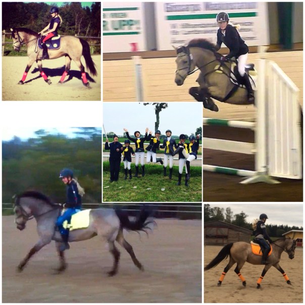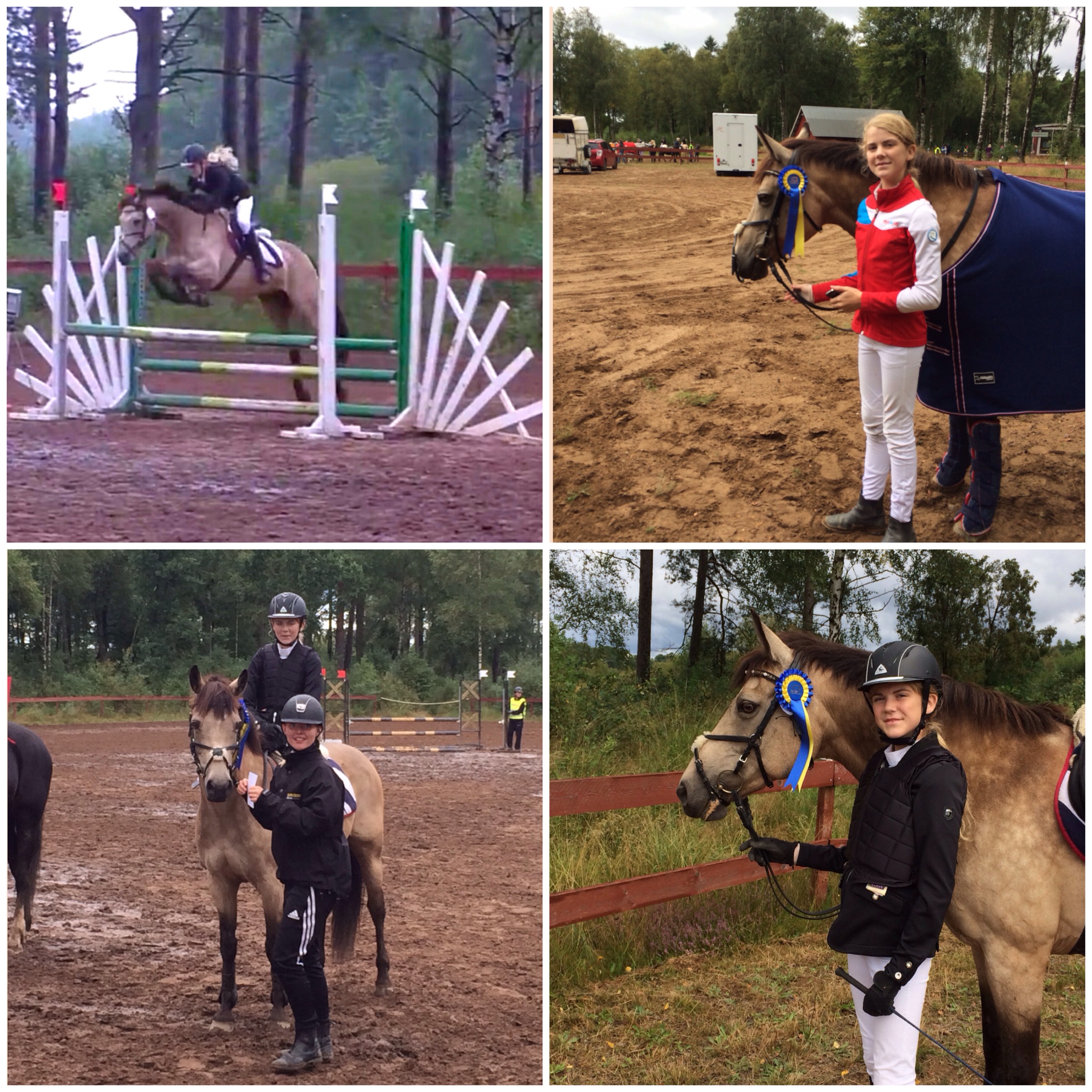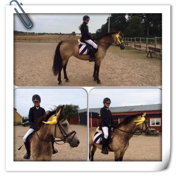 Igår klippte vi Connie. Nu är fina vädret slut och pälsen var på tok för lång. Hon blev jättefin i år! Fotot längst ner till vänster, dock dålig bild, fotad i halvskymning. Klippte senare nu än förra året. Då fick jag klippa två gånger och det ville jag undvika i år, därav först nu. Bra beslut kändes det som. Hon fick behålla sina nyanser om än i mera gråton. En ny ponny mentalt fick vi oxå! Thea red en kort tur barbacka efter klippningen och hon hade varit superpigg! Idag var hon så pigg när Thea tränade att hoppa hinder snett med omhoppningstempo och väg, att hon bockade! Hon försökte ett antal gånger först som Thea lyckades avstyra, men när hindret höjdes och eftergiften blev större så kom en bockning a-la-Connie och pang! Thea satt på marken, helt oskadd! Inte kul att Thea föll, men kul att Connie är så pigg och glad. Thea hoppade upp igen och fick jobba lite med samlingen men gjorde sedan om ”åttan” kanonbra. Riktigt roligt att se.
